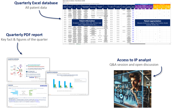 The Silicon Anode Li-ion Batteries patent monitoring service allows you to take advantage of a quarterly-updated Excel file and benefit from both quarterly analysis reports and direct interaction with our analysts.