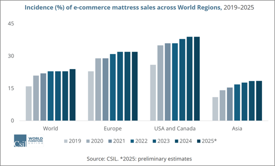 Mattress sales and e-commerce mattress sales are provided for the time series 2020-2025 by country/region.