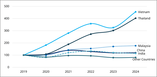 根據CSIL統計,亞太地區照明設備產值超過580億美元。中國是該地區最大的照明設備生產國,其次是日本和印度。出口約佔總產量的一半,北美是主要出口目的地。越南是第二大出口國,其產量也顯著成長。