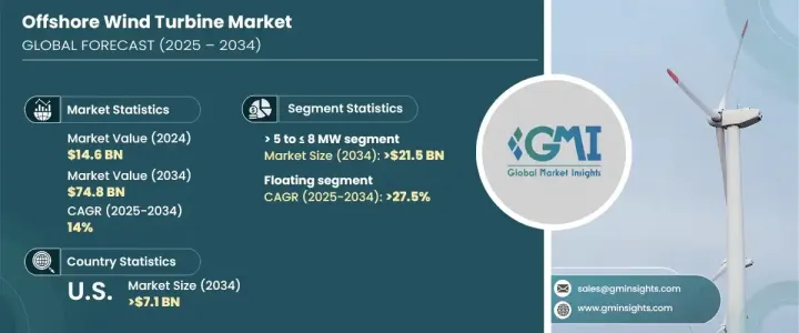 2024 年全球離岸風力渦輪機市場規模達到 146 億美元,預計 2025 年至 2034 年期間將以 14% 的強勁複合年成長率擴張。離岸風力渦輪機利用風能發電,通常安裝在海洋或大型湖泊等大型水域。這些渦輪機旨在承受惡劣的海洋環境,並根據水深安裝在浮動平台或固定基礎上。隨著政府和企業越來越重視永續能源解決方案,向再生能源的日益轉變是推動市場擴張的關鍵因素。
