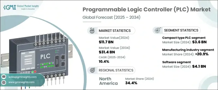 2024 年全球可程式邏輯控制器市場價值為 117 億美元,預計 2025 年至 2034 年的複合年成長率為 10.4%。工業 4.0、數位孿生技術和自動化驅動解決方案的日益普及正在推動市場擴張。由於基於 PLC 的系統在自動化生產線和最佳化製造效率方面發揮關鍵作用,因此電動車 (EV) 的需求不斷成長,進一步加速了成長。汽車製造商依靠 PLC 驅動的解決方案來簡化電動車的生產、增強可擴展性並減少停機時間。此外,這些系統對於電池製造和複雜的組裝過程至關重要,可確保最高的生產力。