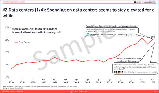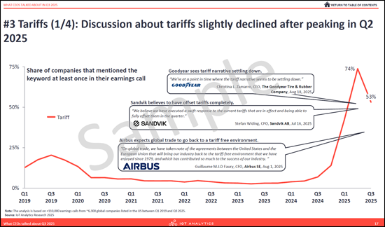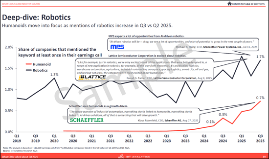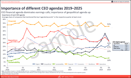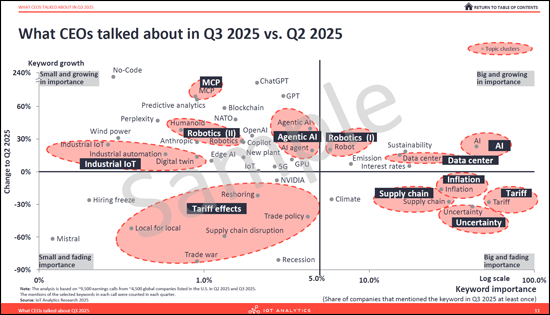 The "Quarterly trend report: What CEOs talked about in Q3 2025" is part of IoT Analytics' ongoing coverage of the IoT and related technology markets. The information presented in this report is based on a database of 110,000+ earnings calls of US-listed companies from Q1 2019 through Q3 2025. Every quarter, IoT Analytics analyzes some trends that emerge in the earnings calls and presents some findings for the most recent quarter. The purpose is to inform other market participants about the current focus of CEOs and companies. To ensure objectivity, IoT Analytics did not alter or supplement any results and did not exclude any earnings calls deliberately.