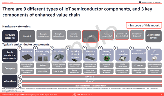 • 148頁報告: 全面分析物聯網半導體價值鏈,重點在於關於設計、IP 和製造生態系統。