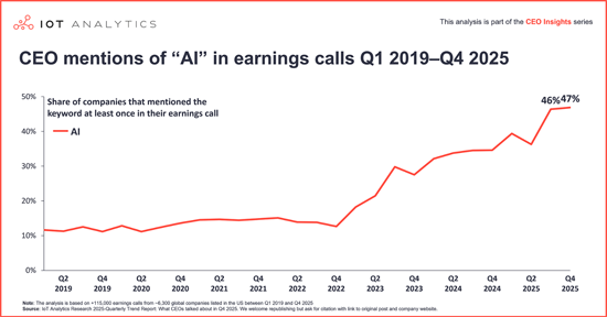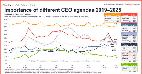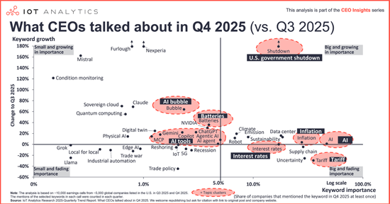 The Quarterly trend report: What CEOs talked about in Q4 2025 is part of IoT Analytics' ongoing coverage of the IoT and related technology markets. The information presented in this report is based on a database of 115,000+ earnings calls of US-listed companies from Q1 2019 through Q4 2025. Every quarter, IoT Analytics analyzes trends emerging from earnings calls and presents findings for the most recent quarter. The purpose is to inform other market participants about the current focus of CEOs and companies. To ensure objectivity, IoT Analytics did not alter or supplement any results and did not deliberately exclude any earnings calls.
