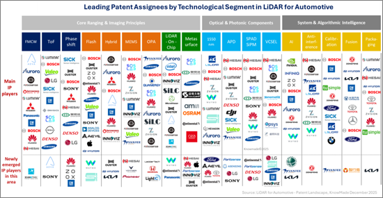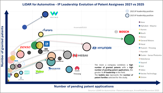 從 2021 年到 2025 年,隨著跨技術、跨地區和跨行業領域的競爭日益激烈,雷射雷達 (LiDAR) 智慧財產權的領導地位發生了顯著變化。該生態系統由四大類組成:純光達公司、一級供應商、汽車製造商和自動駕駛公司。本報告對每一類公司進行了更深入、更詳細的分析,揭示了隨著競爭加劇,2021 年至 2025 年間領導地位、技術能力和智慧財產權組合的變化。尤其值得注意的是,在過去幾年裡,專注於雷射雷達(LiDAR)領域的公司在智慧財產權(IP)活動方面明顯加速發展,許多公司在2021年以前所未有的速度強化了其智慧財產權組合。詳細分析顯示,儘管一級供應商在2021年擁有更具競爭力和更成熟的智慧財產權組合,但市場格局正在改變。到2025年,一些專注於光達領域的新興企業將展現出必要的規模、品質和技術深度,從而在多個高成長的雷射雷達細分市場中確立其新興智慧財產權領導者的地位。該報告還揭示了知識產權領域新進入者數量的不斷增長,其中包括快速增長的專注於雷射雷達領域的新興企業、自動駕駛公司和汽車製造商。這些公司快速擴張其智慧財產權組合,顯示其策略影響力日益增強。這些變化預示著雷射雷達生態系統領導地位的重新分配,從而打造出先進感測領域最具活力和競爭性的智慧財產權環境之一。