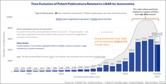 With centimeter-level accuracy and consistent performance across varied lighting conditions, LiDAR is becoming a core sensing modality for ADAS, L2-L4 autonomous driving, robotaxis and a growing range of robotics and infrastructure applications. Its rapidly expanding patent activity reflects this shift, marking LiDAR's transition from an experimental technology to a primary perception sensor in one of the most competitive IP landscapes in advanced mobility. As of October 2025, the global LiDAR patent landscape for automotive applications includes more than 36,200 patent families and over 62,900 individual patents, with strong growth across FMCW LiDAR, solid-state architectures, photonic integration, advanced beam steering and AI-driven perception. Over 24,300 patent families were filed since July 2021 alone, tripling KnowMade's previous dataset and signalling the move from early research to full-scale industrialization. Between 2020 and 2025, LiDAR-related patenting increased at an estimated CAGR of 27%, highlighting the explosive pace of innovation across the sector.