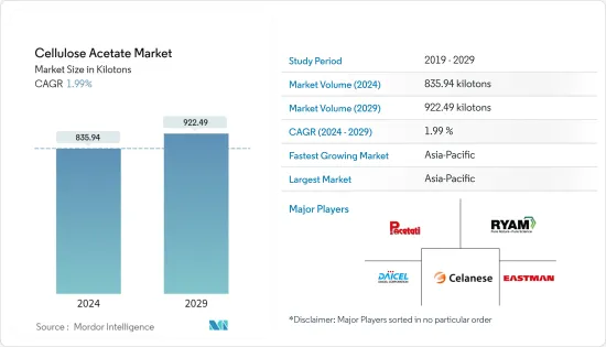 The Cellulose Acetate Market size is estimated at 835.94 kilotons in 2024, and is expected to reach 922.49 kilotons by 2029, growing at a CAGR of 1.99% during the forecast period (2024-2029).