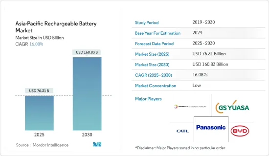 The Asia-Pacific Rechargeable Battery Market size is estimated at USD 76.31 billion in 2025, and is expected to reach USD 160.83 billion by 2030, at a CAGR of 16.08% during the forecast period (2025-2030).