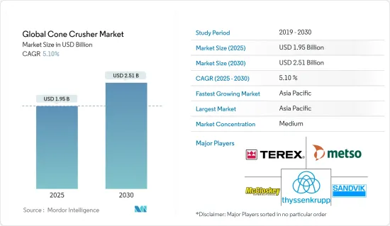 The Global Cone Crusher Market size is estimated at USD 1.95 billion in 2025, and is expected to reach USD 2.51 billion by 2030, at a CAGR of 5.1% during the forecast period (2025-2030).