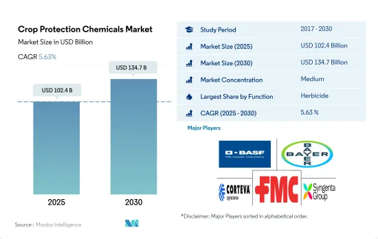 The Crop Protection Chemicals Market size is estimated at 102.4 billion USD in 2025, and is expected to reach 134.7 billion USD by 2030, growing at a CAGR of 5.63% during the forecast period (2025-2030).