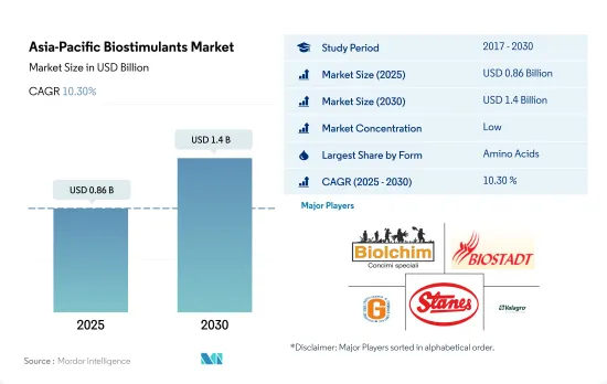 The Asia-Pacific Biostimulants Market size is estimated at 0.86 billion USD in 2025, and is expected to reach 1.4 billion USD by 2030, growing at a CAGR of 10.30% during the forecast period (2025-2030).