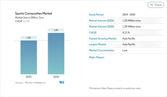 The Sports Composites Market size is estimated at 1.05 million tons in 2025, and is expected to reach 1.29 million tons by 2030, at a CAGR of 4.11% during the forecast period (2025-2030).