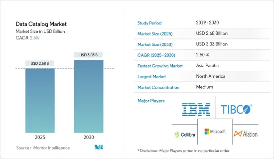 The Data Catalog Market size is estimated at USD 2.68 billion in 2025, and is expected to reach USD 3.03 billion by 2030, at a CAGR of 2.5% during the forecast period (2025-2030).