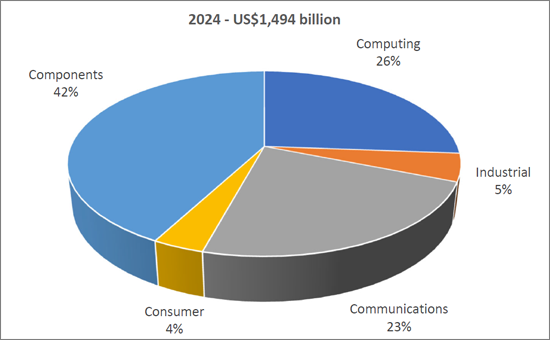 In 2024, the production of electronics equipment and components in Asia was valued at US$1,494 billion of which electronics equipment production accounted for 57.8% of the total with output dominated by computing and communications. Asia is also the centre for electronic component output globally.