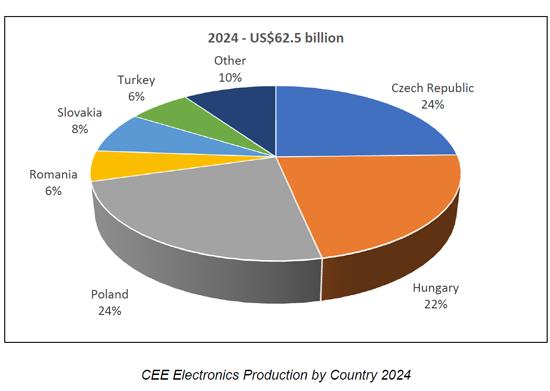 到 2024 年,中歐和東歐的電子元件產量僅佔電子產品總產量的 11.6%。該地區也有許多本地企業,儘管它們規模往往較小,並且專注於被動元件。包括英飛凌科技和安森美半導體在內的外國公司在該國設有分支機構,並正在擴建該地區現有的半導體工廠。安森美半導體於2024年6月宣布計畫投資20億美元,擴大位於捷克共和國現有工廠的碳化矽晶圓生產規模。