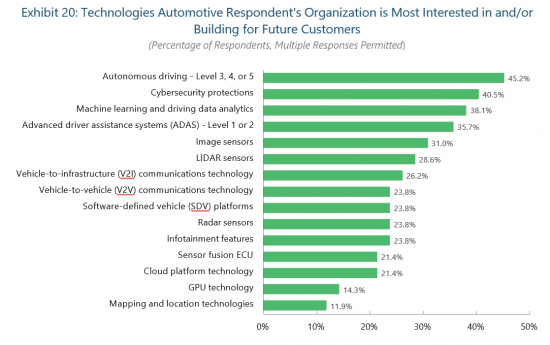 Although Vehicle-to-Everything (V2X) technology has yet to achieve mainstream adoption, surveyed automotive engineers identified Vehicle-to-Infrastructure (V2I) at 26.2% and Vehicle-to-Vehicle (V2V) at 23.8% as key areas of focus [see Exhibit 20]. V2I, V2V, and broader V2X capabilities enhance vehicle safety and situational awareness by enabling data exchange beyond the line of sight and range limitations of onboard sensors.
