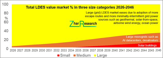 CAPTION: Total LDES value market % in three size categories 2026-2046. Source Zhar Research report, "Long Duration Energy Storage Grand Overview: Technologies, Materials, Projects, Companies, Research Advances in 2025-6, Escape Routes, Markets 2026-2046".