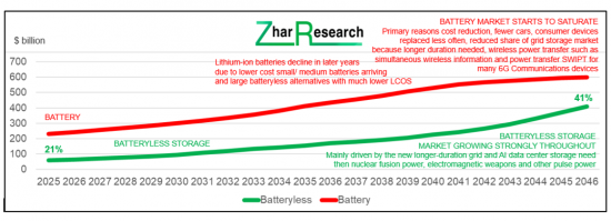 標題:儲能設備市場(電池 vs. 非電池)來源:Zhar Research 報告 "Battery Elimination Creates Large New Markets 2026-2046"